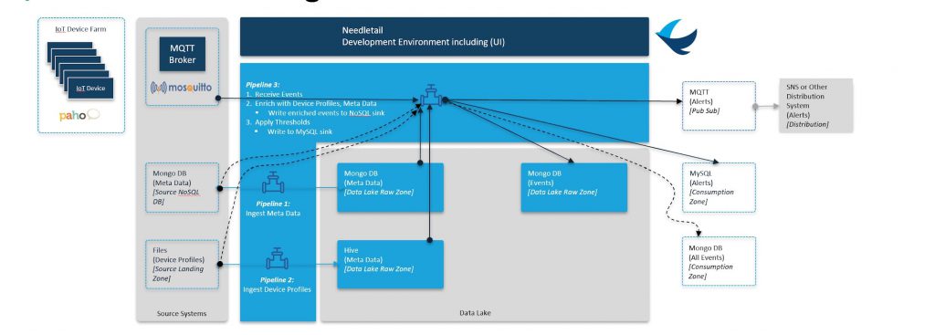 pSolv built the solution using pSolv’s Needletail platform that supports both batch and real-time processing. The Zero Code Needletail platform-based solution ingested real-time events emitted from multiple IoT devices through an MQTT broker(mosquitto), correlated device Id with device information & deployment data provisioned in MongoDB and issued notifications to applications when either temperature or pressure readings were above the configured threshold for a given device type.